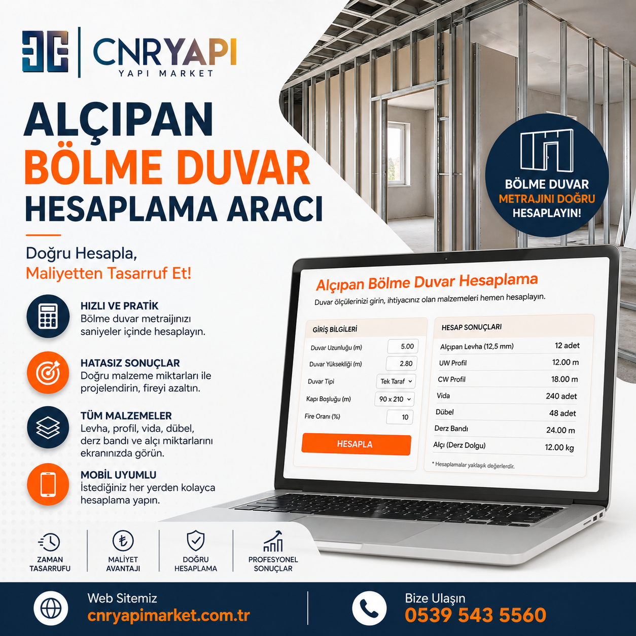Alçıpan bölme duvar uygulamalarında başarı, doğru planlama ile başlar. Geliştirdiğiniz hesaplama aracı sayesinde kullanıcılar hem zamandan tasarruf eder hem de maliyetlerini kontrol altında tutar.
